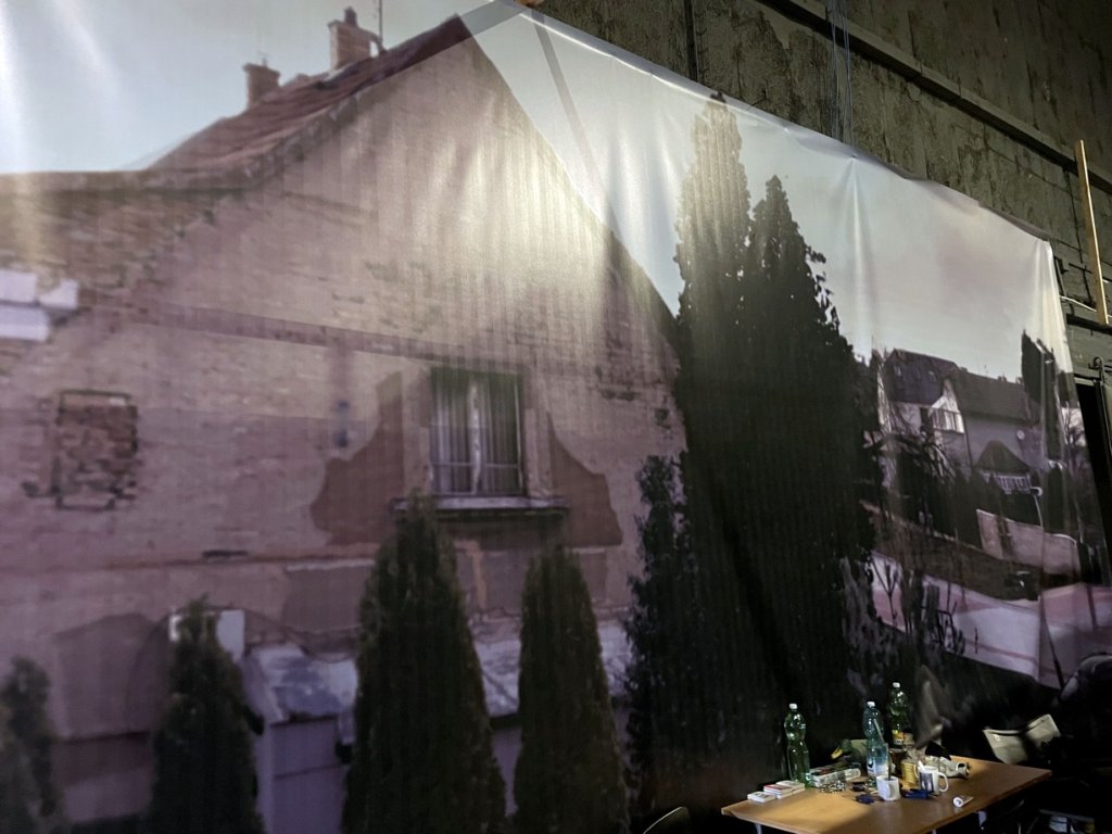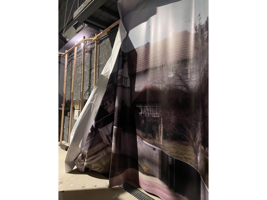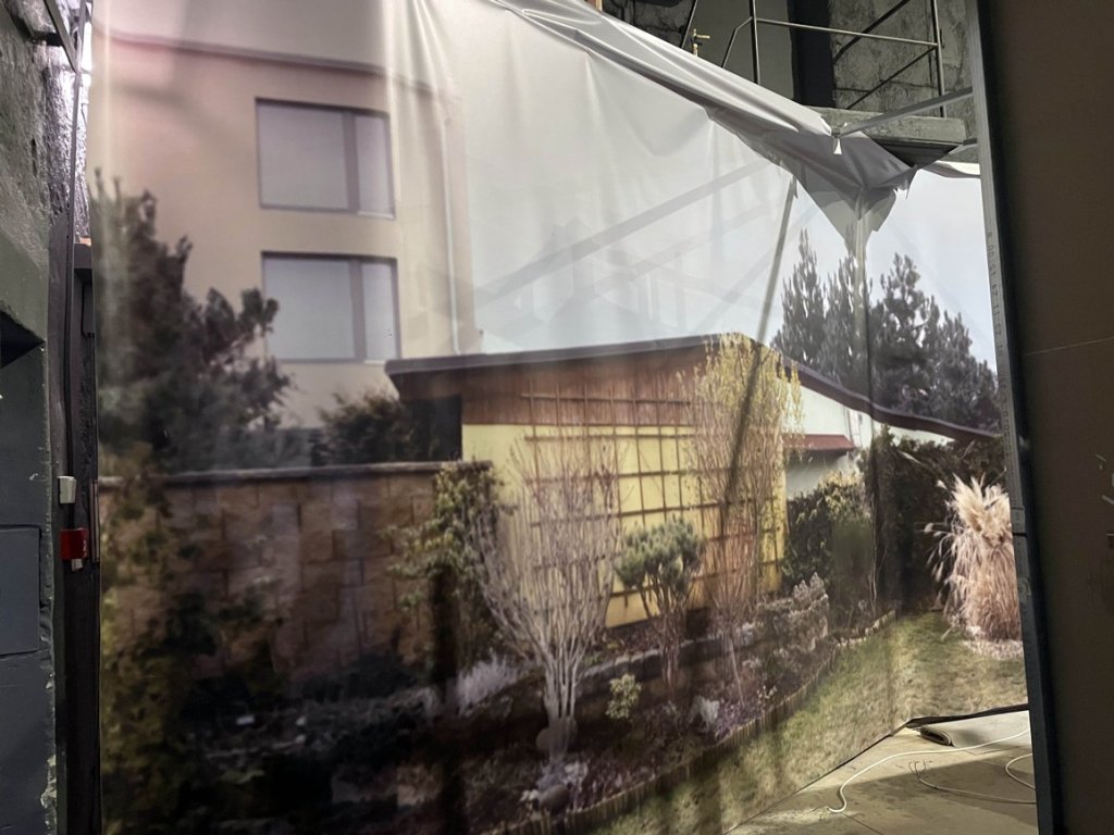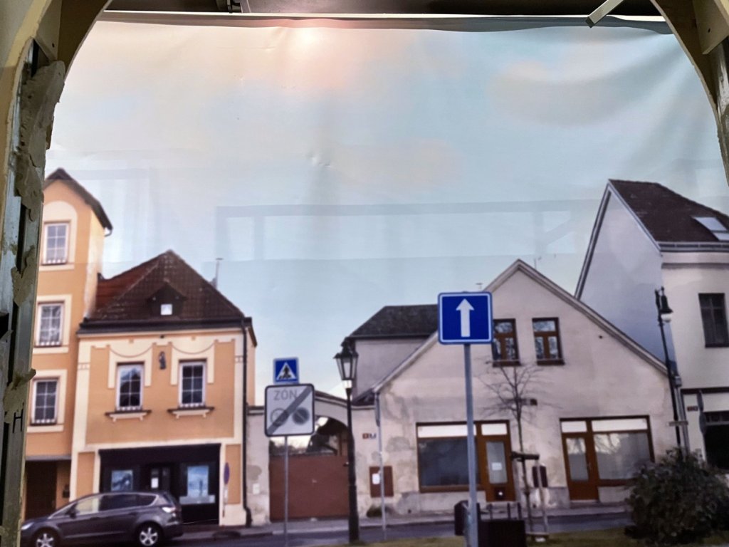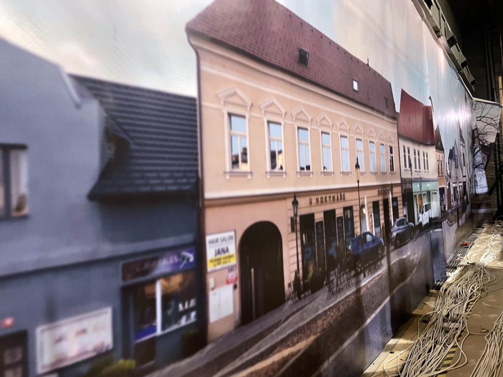 jedna strana bílá, druhá exteriéry města
