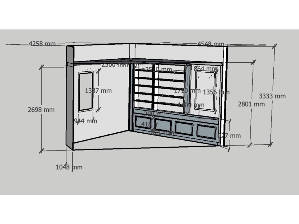 dvě stěny, každá cca 2,5 m tvoří roh mástnosti se stropem