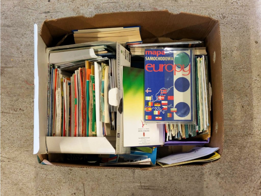 Krabice plná map a průvodců.