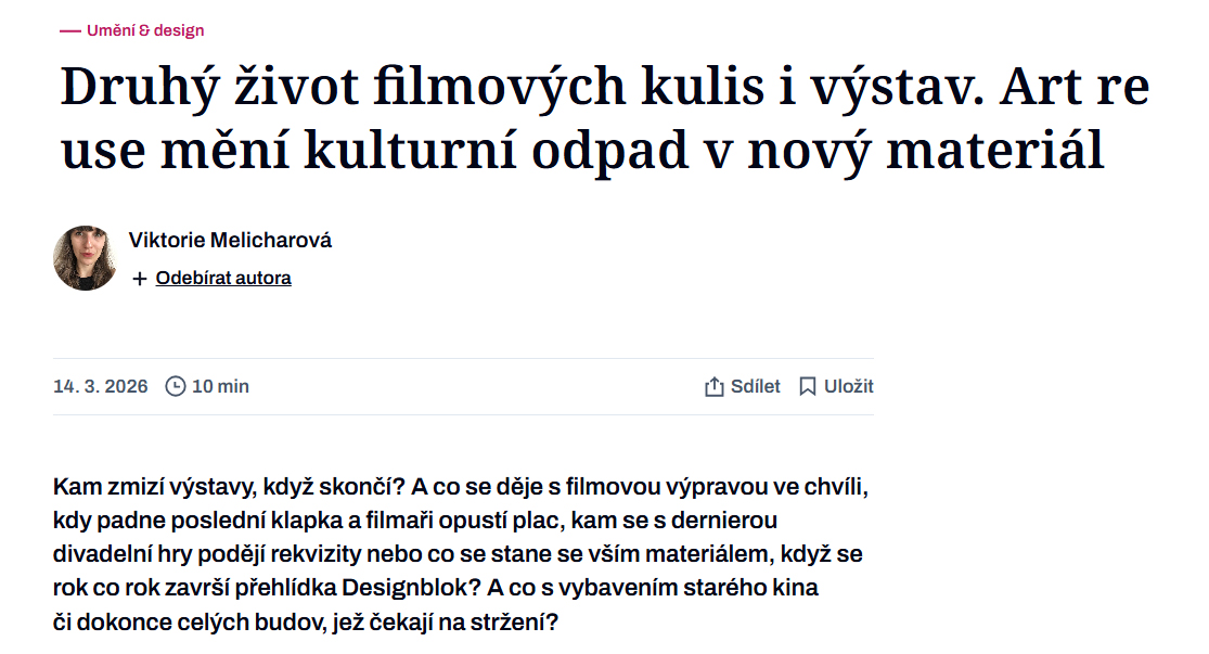 Článek Viktorie Melicharové: „Druhý život filmových kulis i výstav. Art re use mění kulturní odpad v nový materiál.“ (Forbes Life, 14. 3. 2026).