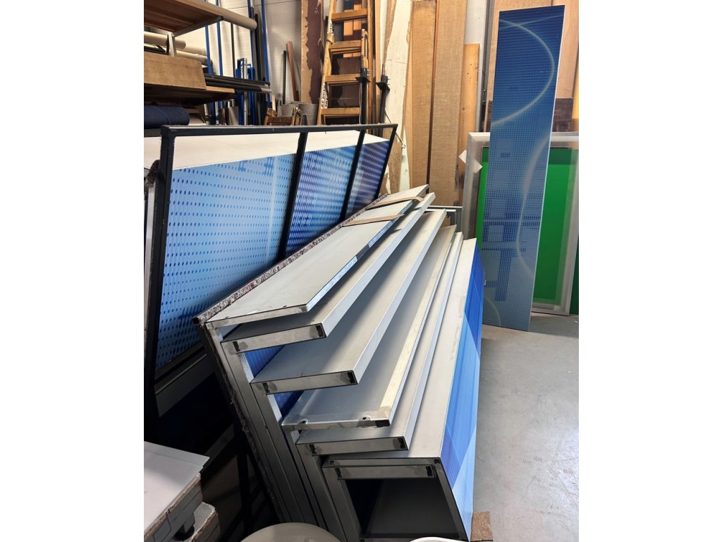 Konstrukce hliník, na kolečkách (s brzdami), panely plexisklo, bez obrazovek, některé podsvětlené
