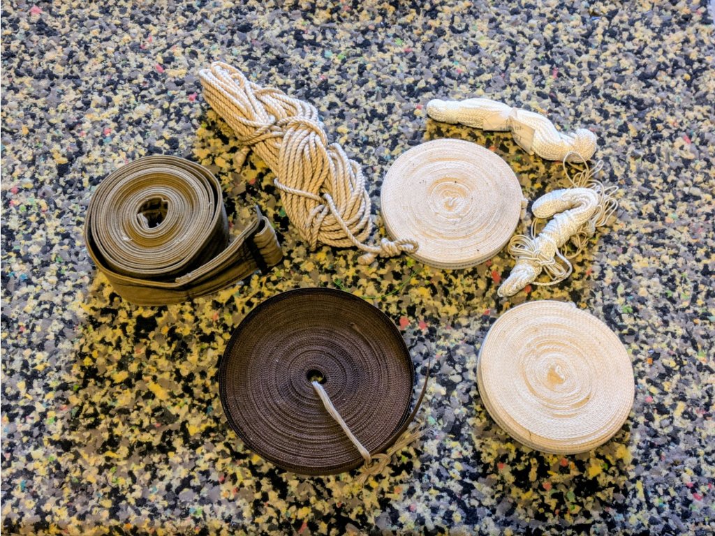 Různé typy provazů, lan, knotů a popruhů.