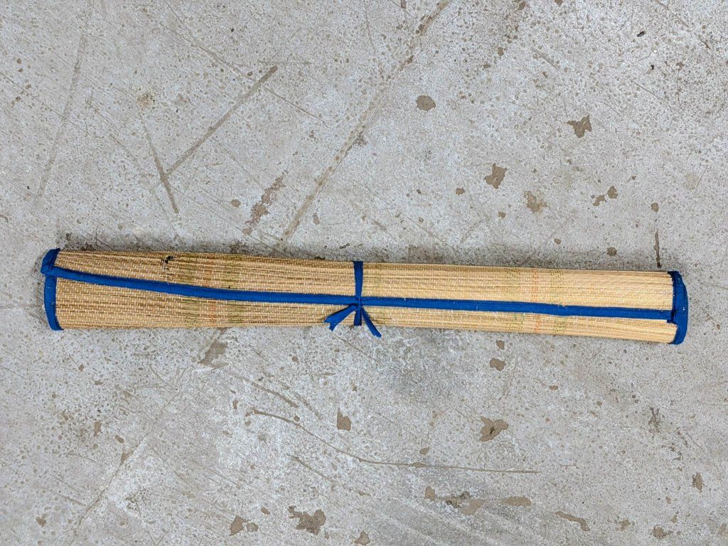 Tkaná slaměná plážová rohož s modrým lemováním.