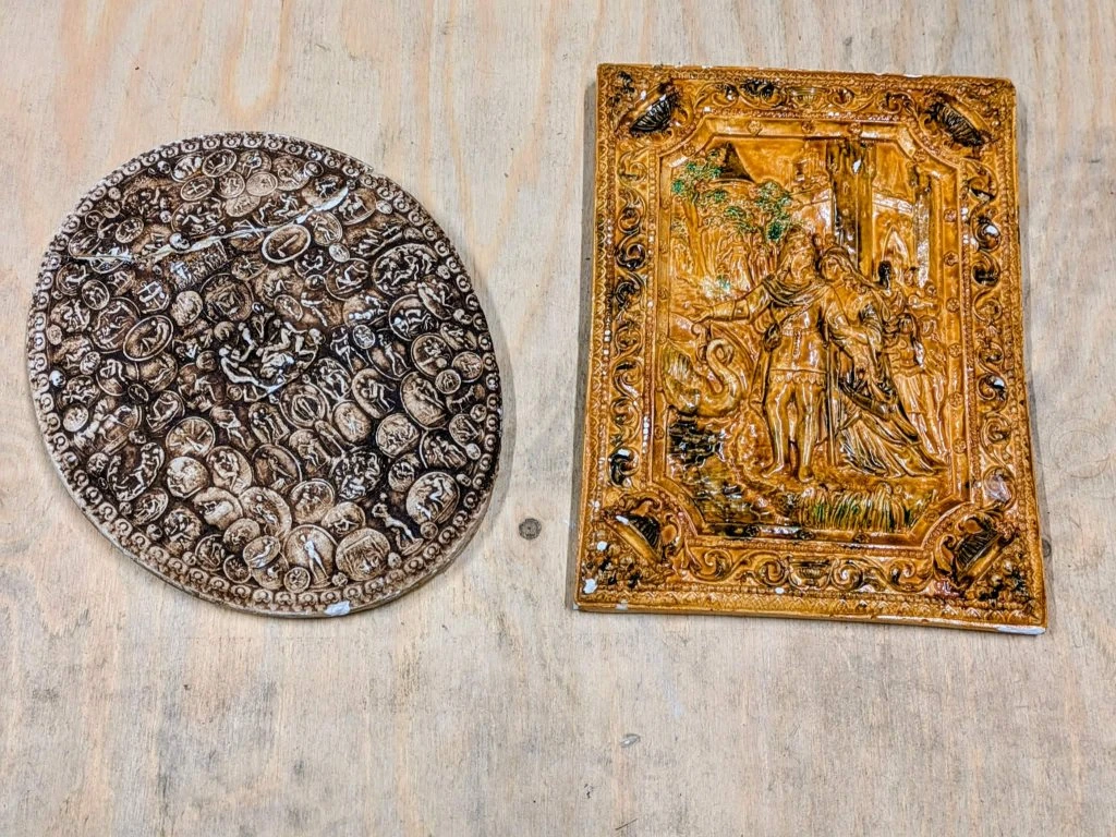 Nástěnné reliéfy vyrobené z glazované sádry, 20 a 25 cm.