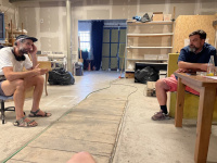 Foto: Přípravy ve skladu art re use s autory (Julius Reichel a kurátor Jiří Ptáček) a návštěva filmových skladů při výběru materiálu k realizaci (Julius Reichel, Jiří Ptáček a Viktor Švolík, student AVU, který obsluhuje výdejní sklad art re use v Praze).