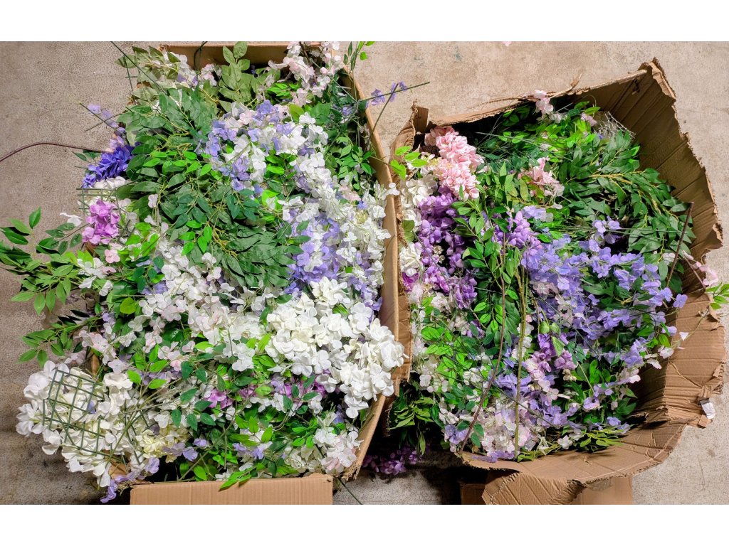 5 velkých krabic umělých květin - tisíce kusů.